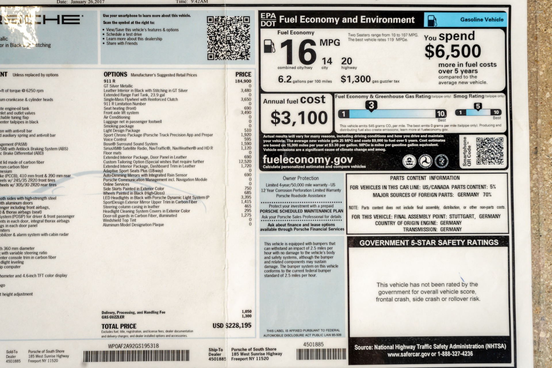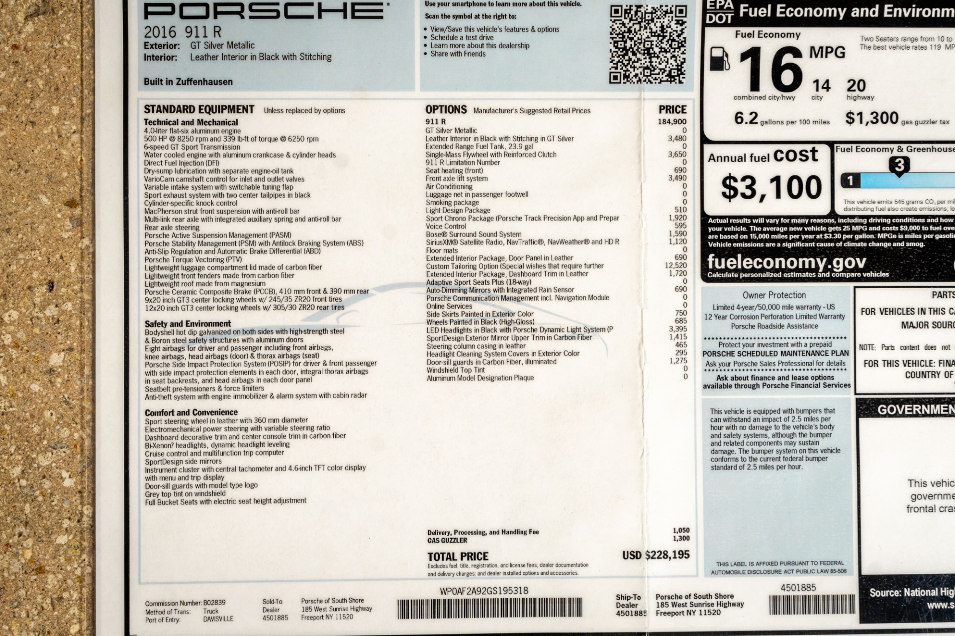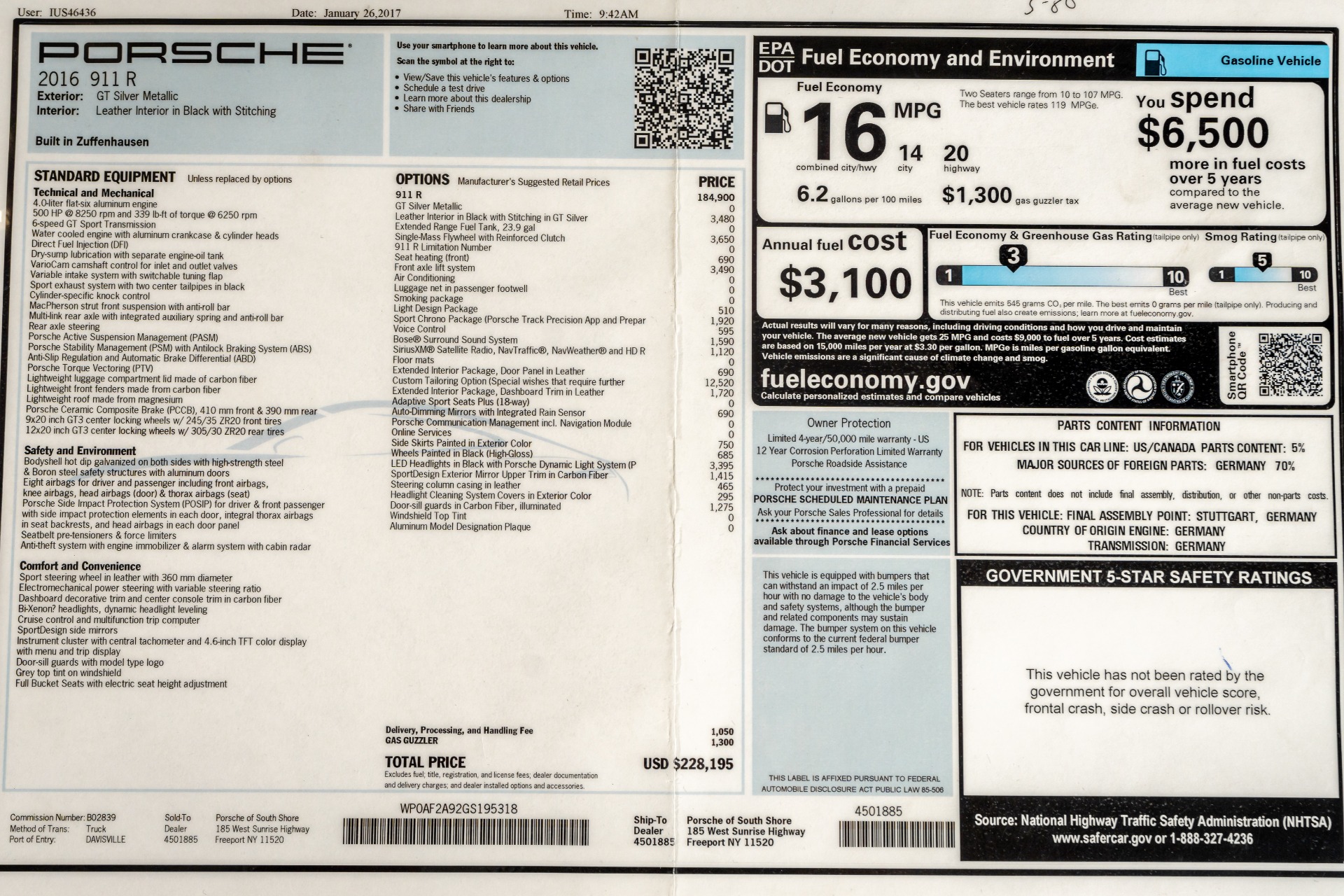 2016 911 R only 991 total produced, only 56 miles on this R from new, car comes with a SUPER build, very high Msrp, single mass flywheel, CXX options and more. Any further questions please contact us. True collector car!!!